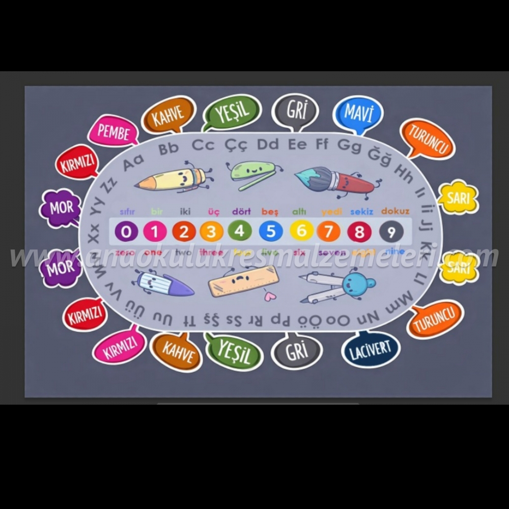 Halı üzerinde bulunan Türkçe ve İngilizce alfabe, rakamlar ve temel renkler, çocukların erken yaşta kavram bilgisi kazanmasına yardımcı olur. Boyama süreci sırasında çocuklar hem renkleri keşfeder hem de harf ve sayı farkındalığı geliştirerek öğrenmeyi kalıcı hale getirir.