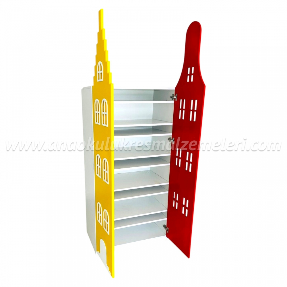 80 cm genişlik ve 160 cm yükseklik ölçülerine sahip olan geniş iç hacmi sayesinde yalnızca ayakkabılarınızı değil; oyuncak, kitap, aksesuar ve kişisel eşyalarınızı da düzenli bir şekilde saklamanıza olanak tanır. Raflı yapısı pratik kullanım sağlarken, mimari Amsterdam ev silüeti, pencere ve kapı detaylarıyla dekoratif bir mobilya niteliği taşır.